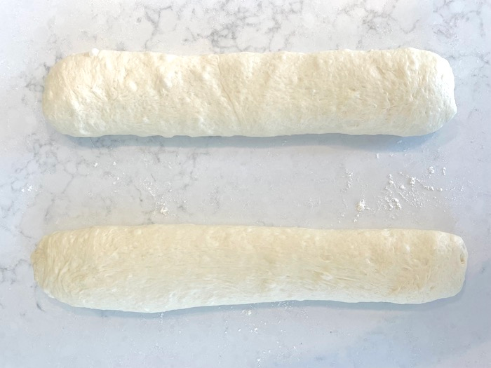 4. Again, gently flatten each log piece of dough into a rectangle, taking care to preserve the air bubbles trapped within. Roll dough again into a log shape. Pinch seam of roll with your fingers to seal. Place baguettes seam-side down on the baguette baking pan dusting with flour. Cover baguettes loosely with cling film and allow to rise for a further 45 minutes.