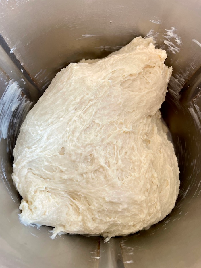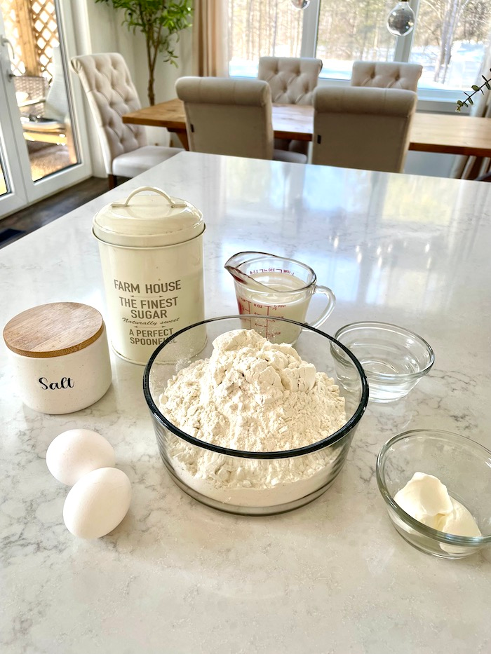- Start off by making the dough so it can rest for a little while. Combine the liquid ingredients in a large bowl or Thermomix bowl, whisk together the eggs, sour cream, lukewarm water and milk.