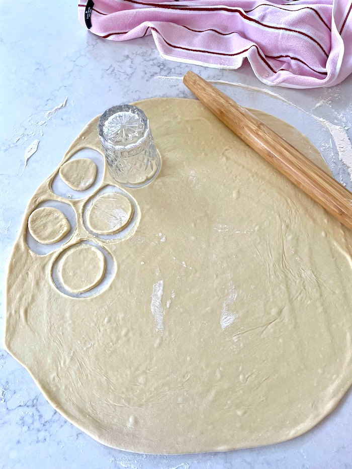 - Stamp out the dough circles. Use a cookie cutter or cup to stamp out small circles in the dough.