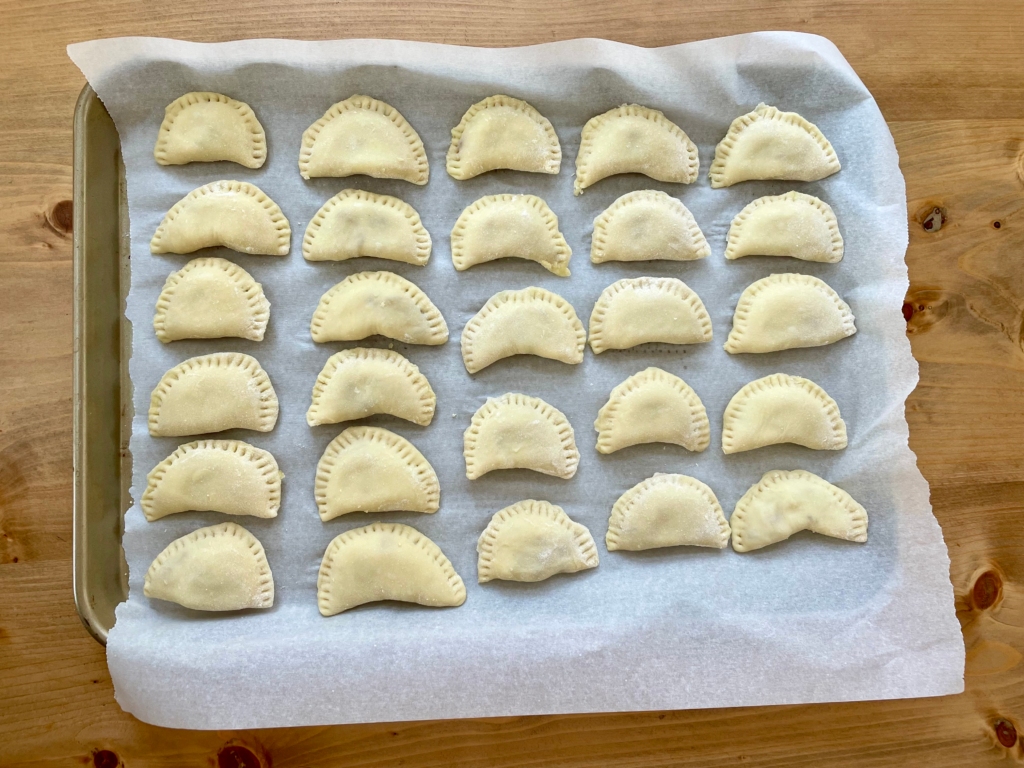 3. Make the filling. In a frying pan caramelize chopped onions with olive oil. Use leftover mashed potatoes (see recipe below) and combine the onions into the mashed potatoes.