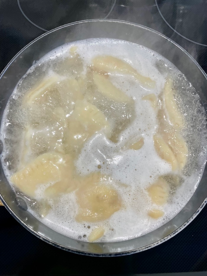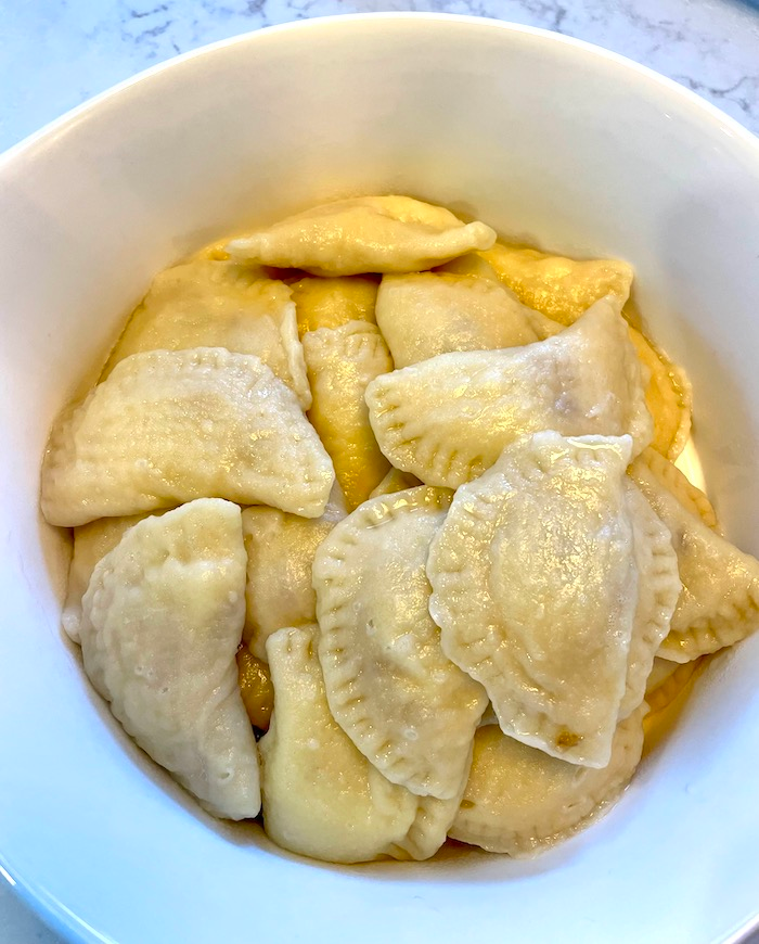 I love to pan fry the leftover Pierogies the next day which gives a golden crust to it.