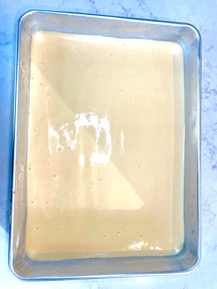 - Line a baking tray with parchment paper, pour in the batter, and spread evenly.