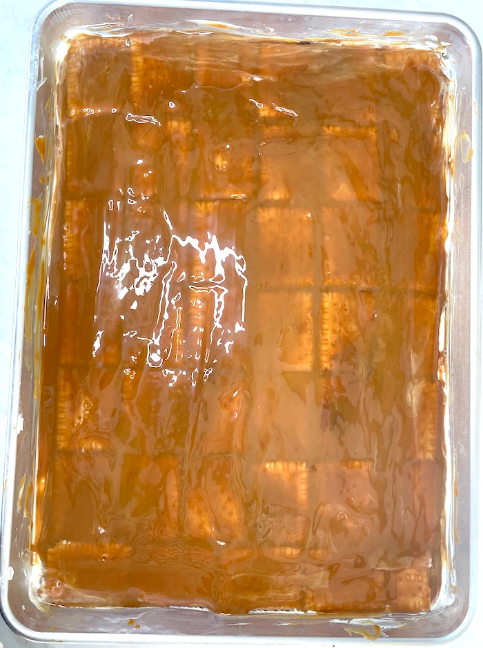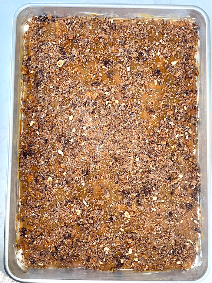 - Sprinkle the chopped Toffifee over the caramel layer.